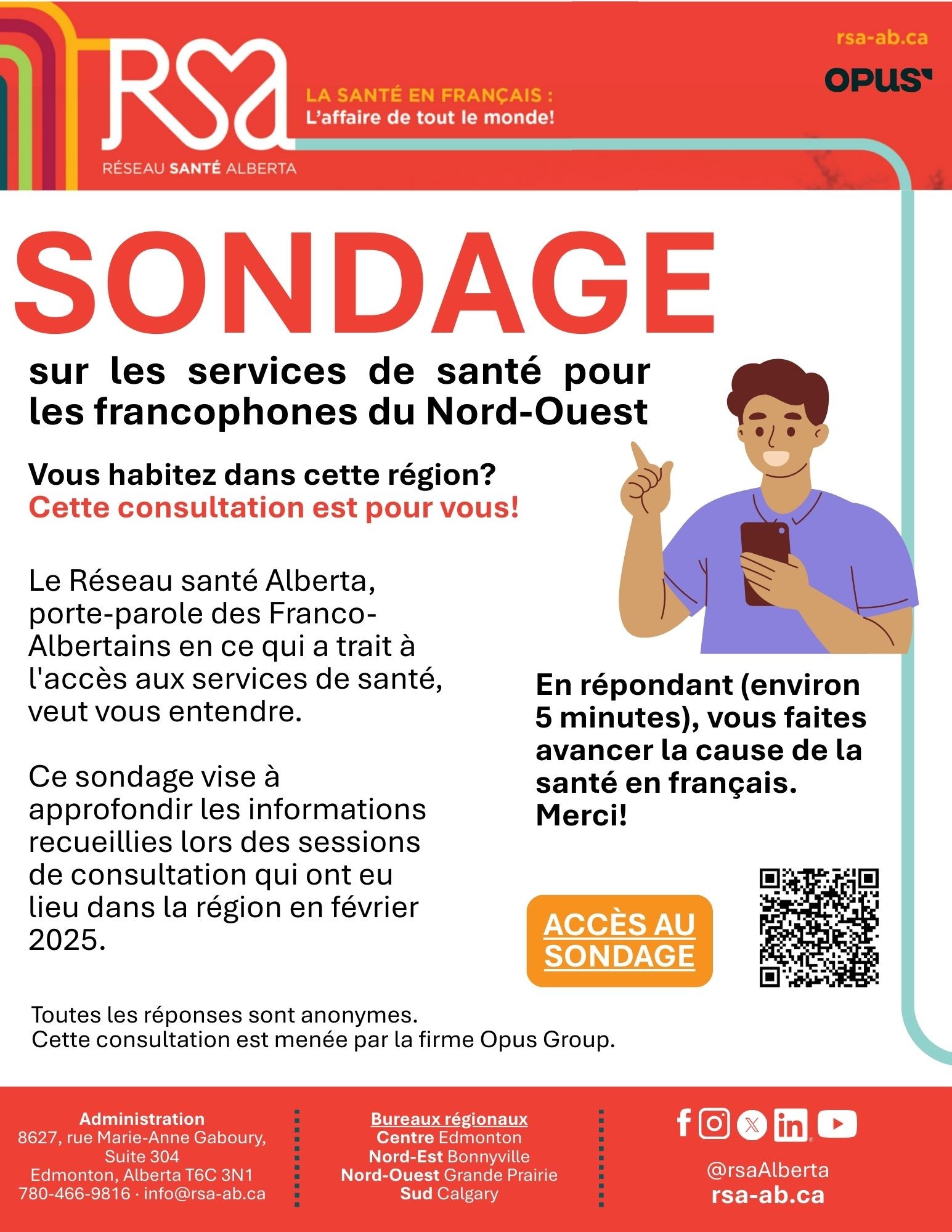 Réseau santé Alberta (RSA), in partnership with Opus Group, is conducting a study to better understand the needs and challenges related to accessing French-language health care in the Northwest region. 👉 Take a few minutes to complete the survey and make your voice heard: cliquez ici